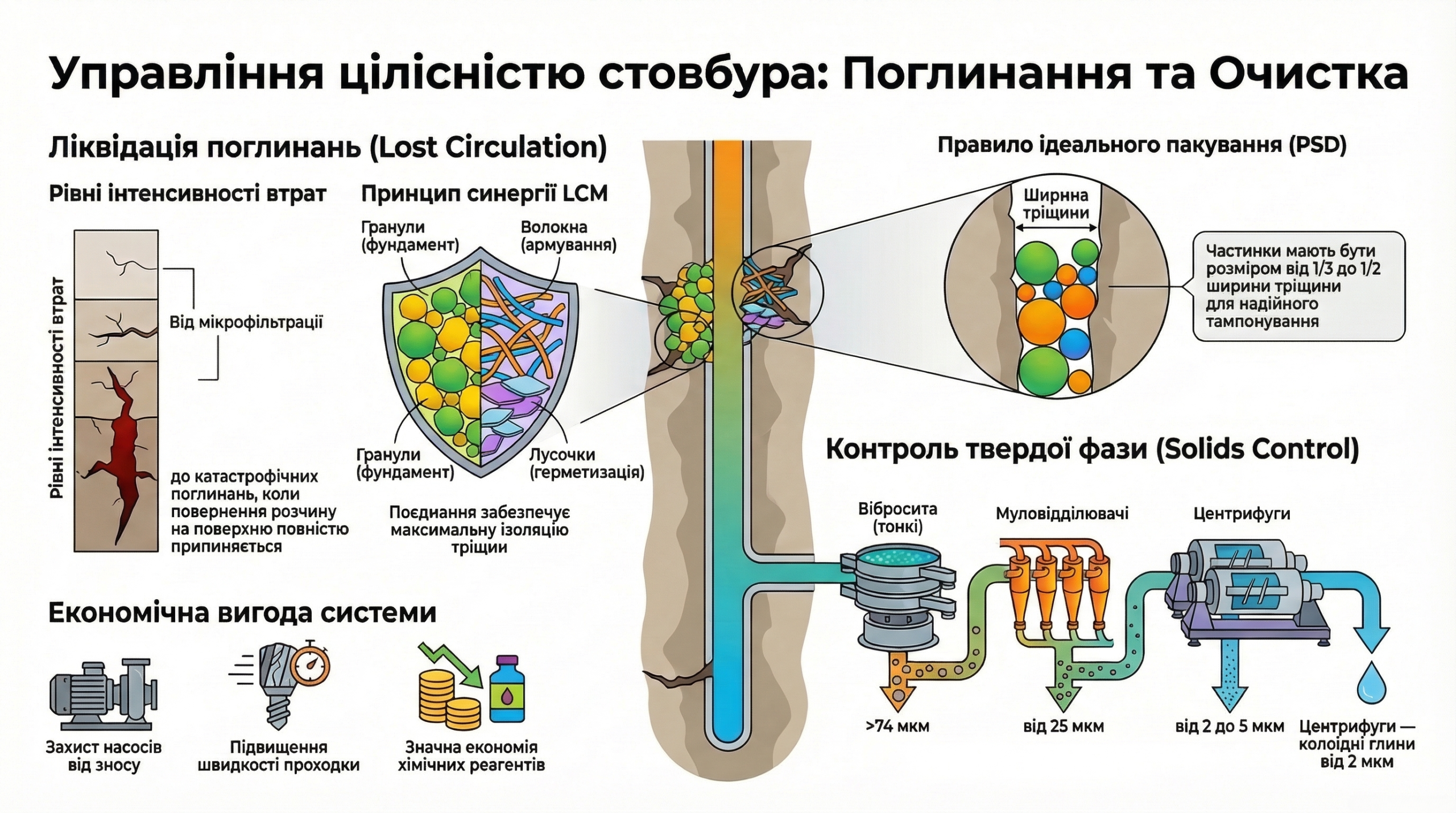 Технологічна дисципліна на етапі підготовки розчину, що включає обов’язкове кондиціонування води содовими реагентами для мінімізації негативного впливу солей кальцію та магнію, є фундаментом, на якому будується вся подальша реологія системи. Динамічне управління в’язкістю за допомогою електростатичних дефлокулянтів, зокрема лігносульфонатів, та своєчасне застосування мультимодальних комплексів кольматаційних матеріалів з урахуванням оптимізації їхнього гранулометричного складу, виступають надійною гарантією попередження таких катастрофічних ускладнень, як втрата циркуляції та прихват інструменту. Нерозривний зв’язок хімічної досконалості розчину та механічної ефективності багатоступеневих систем контролю твердої фази дозволяє не лише забезпечувати рекордні швидкості буріння, але й суттєво мінімізувати екологічне навантаження на довкілля та оптимізувати загальний бюджет проекту за рахунок рециркуляції реагентів.